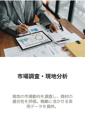 素材や技術、物語性に優れた高付加価値の商材を、現地消費者に「伝わる形」で届けることを使命とし、市場調査・ブランディング・展示・販売・PRまで一貫したサポートを行っております。